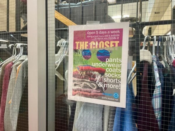 Tucked between a glass wall and a set of stairs in the school’s library, the space is filled with racks of jackets and shelves of folded clothing, all free for students to take whenever they need them. Known simply as The Closet, the student-run project provides warm clothing to students who need it, without the awkwardness or stigma sometimes attached to asking for help.