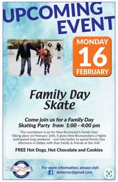 On Monday, Feb. 16, from 1 to 4 p.m., there will be a Family Day skate at the Debec skating rink.