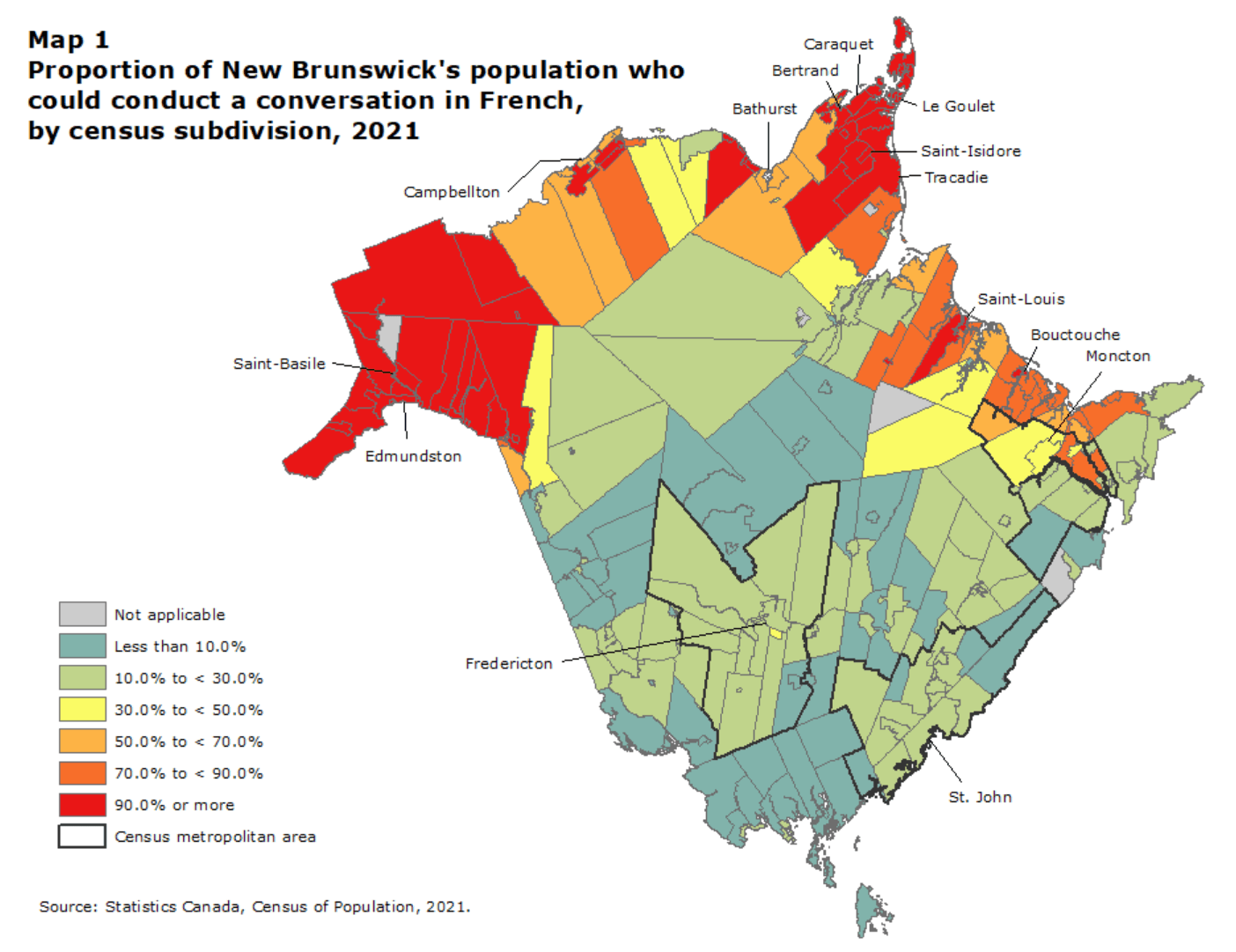 According to the 2021 Canada Census, the proportion of the population who can conduct a conversation in French in the Woodstock region was between 10 and 30 per cent. In the 2016 Canada Census, the area was listed as having fewer than 5 per cent of residents who could speak French.