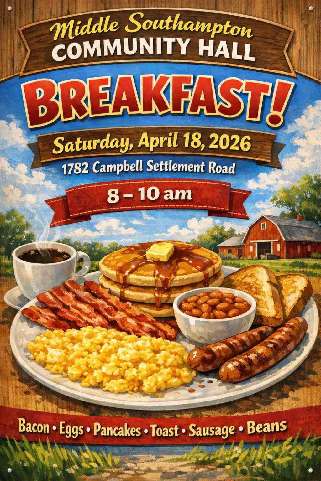 Join friends and neighbours this weekend at the Middle Southampton Community Hall for a big breakfast. The breakfast, located at 1782 Campbell Settlement Hall, begins on Saturday, April 18, from 8 to 10 a.m. Treat yourself to a morning meal consisting of eggs, bacon, pancakes, toast, sausage, and beans.