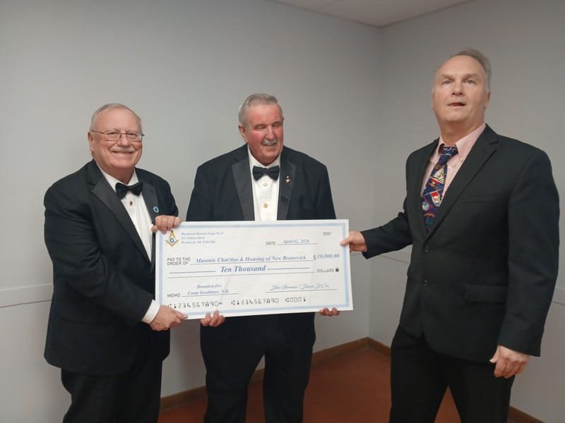 In early April, the Woodstock Masons presented a $10,000 cheque to Masonic Charities and Housing of New Brunswick to help kids attend Camp Goodtime this summer. The camp is held at the YM/YWCA Camp Glenburn in Kings County and is for kids with cancer ages 7 to 13, offering a summer camp experience in a medically supported environment.