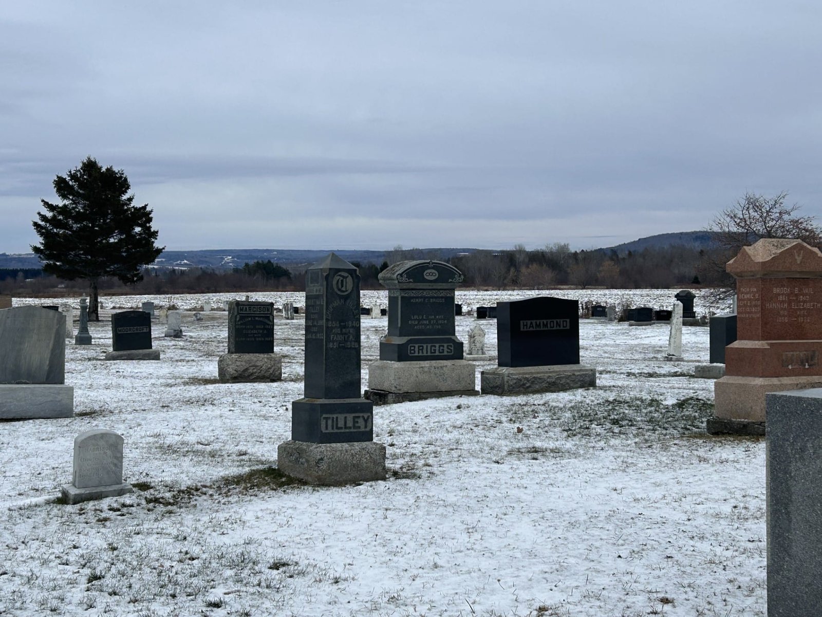 Family names found on the stones include Colpitts, Briggs, Havens, Slipp, Sharpe, Burpee, Cheney, Minard, Good, Green, Hayward, Kearney, Johnston, Kinney, London, McCain, McLean, McNally, Price, Seeley, Tilley, Tompkins, Vail and Bulmer. The oldest name on any stone is Joseph Risteen.