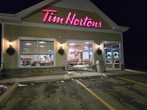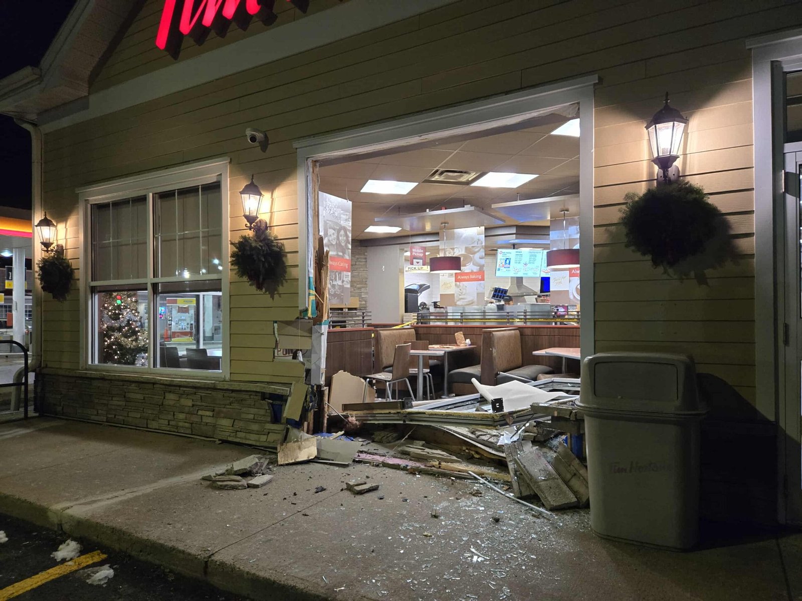 Employees and patrons of Tim Horton’s in Florenceville-Bristol got a jolting surprise on Tuesday night, Nov. 18, when a Jeep drove into the front of the restaurant, causing significant damage.
