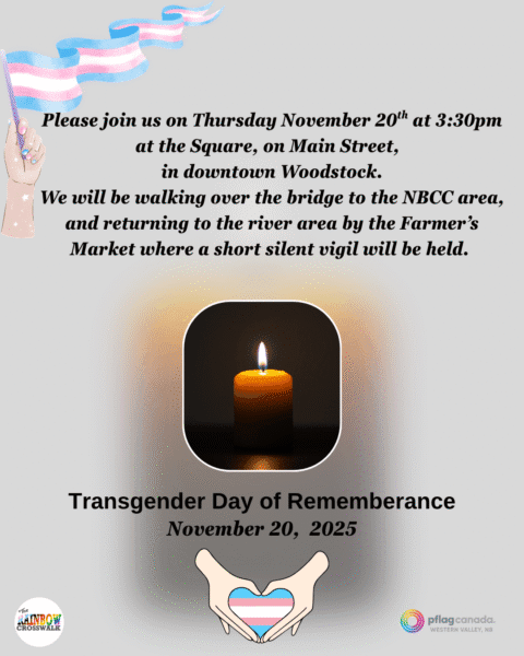The Rainbow Crosswalk organization and PFLAG Western Valley NB are holding Woodstock’s first Transgender Day of Remembrance on Thursday, Nov. 20, at 3:30 p.m.